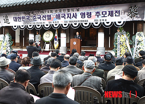 17일 오후 서울 서대문구 독립공원에서 열린 대한민국순국선열·애국지사 영령 추모제에서 대한민국순국선열유족회 유금종 회장이 개회사를 하고 있다. 2013.11.17. (사진=국가보훈처 제공)