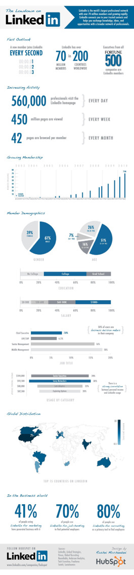 링크드인(LinkedIn,링트인)은 비즈니스와 직업에 집중된 소셜 네트워킹 사이트입니다. 2002년 설립, 2003년 5월에 처음 서비스를 시작했습니다. 올해 6월 200 국가에서 7천만 유저를 확보했습니다. 우리나라에는 링크나우라는 유사 SNS 사이트가 있습니다. 인포그래픽 소스